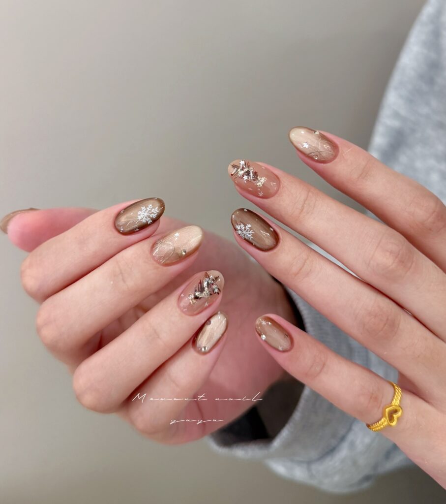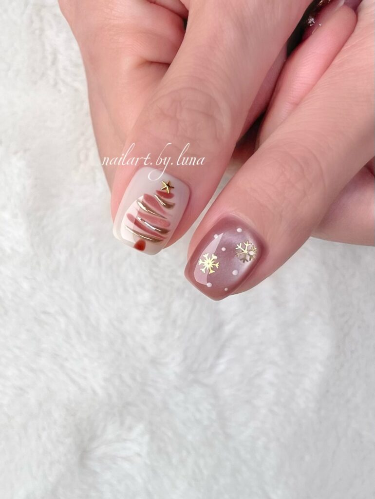 聖誕樹、雪花和星星,可說是聖誕美甲的三本柱!雪花美甲和星星美甲較不受時間限制,整個冬季都能暢行無阻。若是打算在指尖種上一棵小樹,不妨考慮以手繪美甲來表現!只要以抽象、幾何、流線的畫法來描繪,即便是節慶感強烈的聖誕樹,也能自然融入整體美甲設計,過了聖誕節也坦蕩自在。