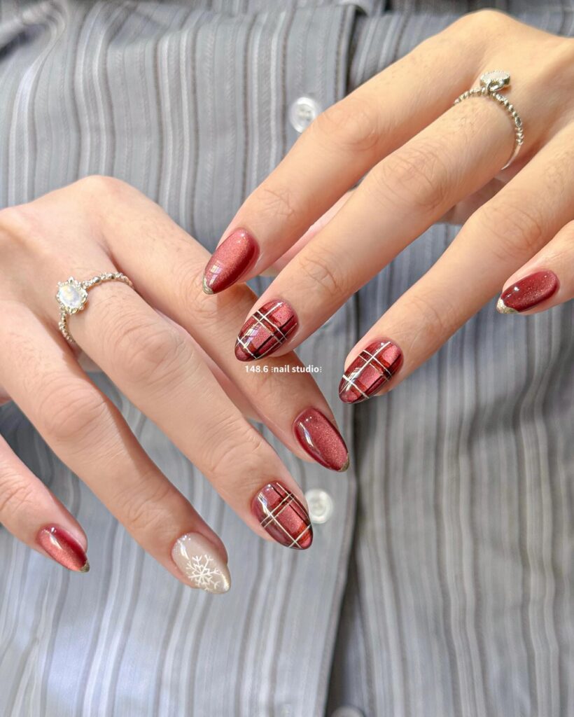 格紋是常見的經典搭配!只要稍加改變線條的粗細、間距與顏色組合,就能大大改變整體印象,換上一手美美的格紋美甲,便會讓人聯想到溫暖的毛線大衣、鬆軟的針織蓋毯。格紋美甲就像是為指尖套上一件小毛衣,彷彿能趕走手腳的冰寒,心頭也跟著暖起來,也是很適合冬季聖誕與跨年的美甲款式哦!